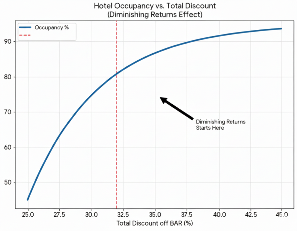 As shown in the Hotel Occupancy vs. Total Discount graph, the relationship between price and bookings isn't a straight line—it's a curve of Diminishing Returns.
